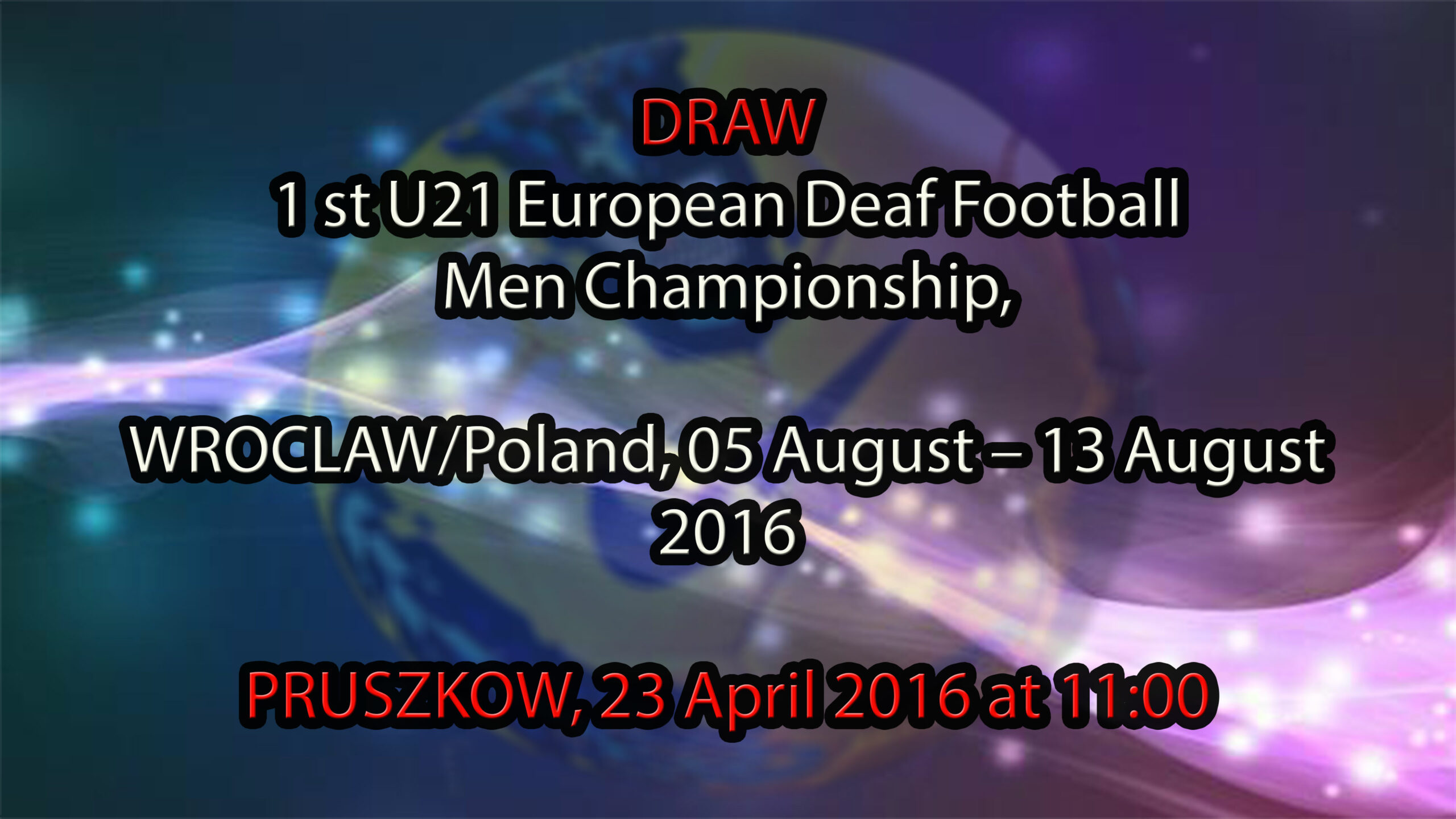 Updated 18th April 2016: DRAW regarding 1st U21 European Deaf Football Men Championship, WROCLAW/Poland, 05 August – 13 August 2016 will be arranged in PRUSZKOW/Poland, 23 April 2016 at 11:00 CEST (9:00 UTC). Live video will be at here: https://www.youtube.com/channel/UCMS-99bBZlKRhS6MTEHRjnw/live