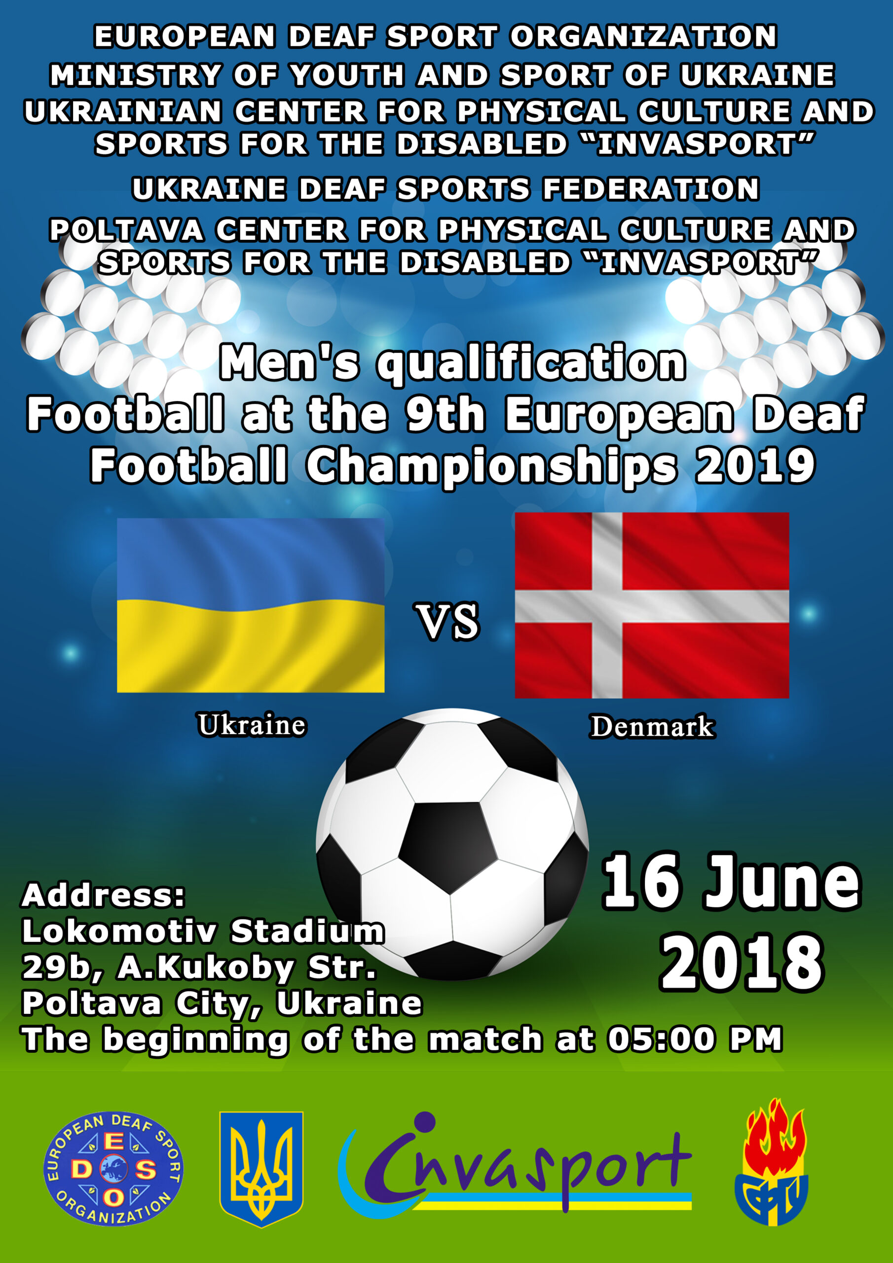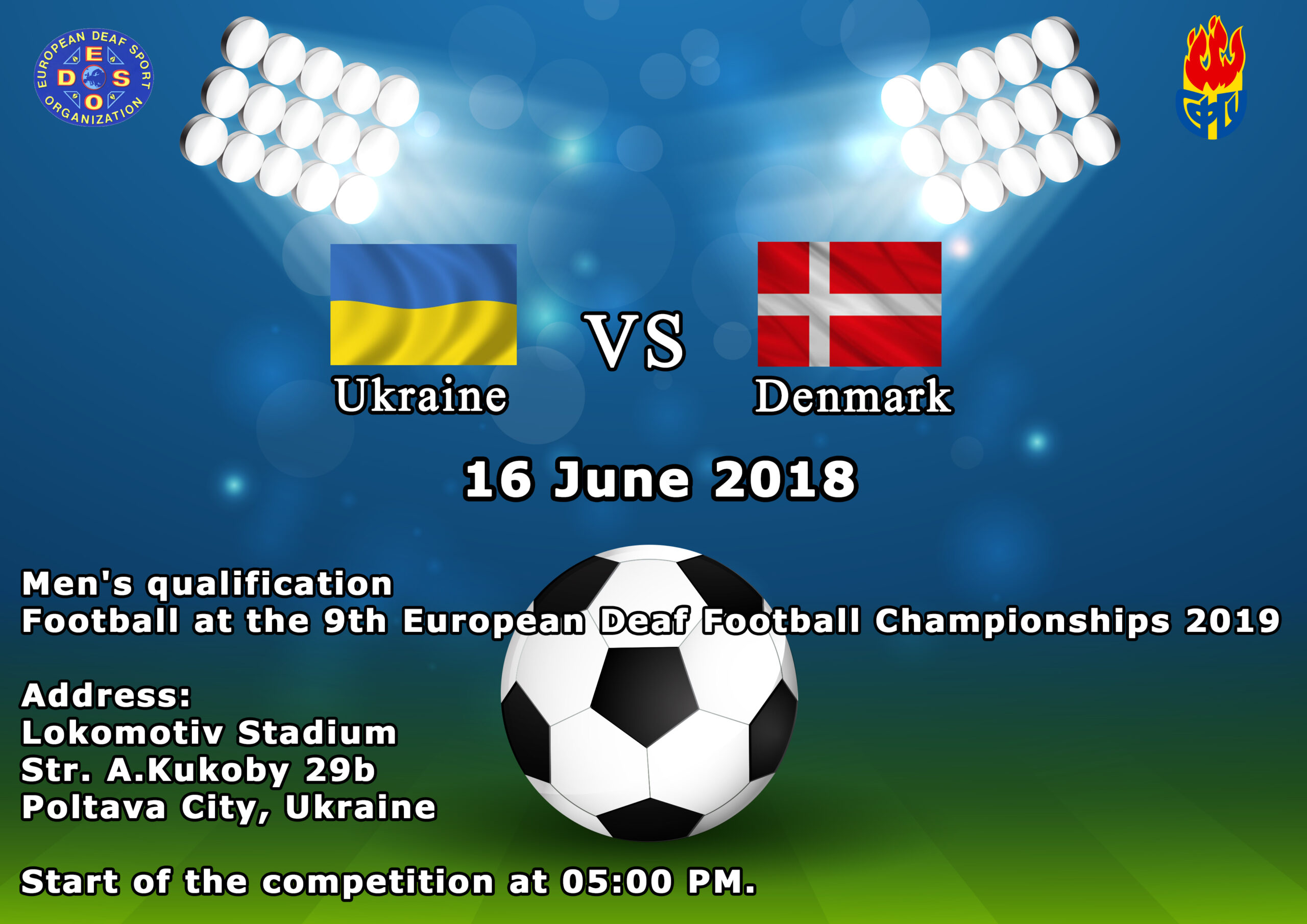 Updated 27 Mar 2018: Added the poster of UKR – DEN match, which will be held in 16 June at 17.00 (Ukraine time?) in Lokomotiv Stadium, Poltava City, Ukraine.