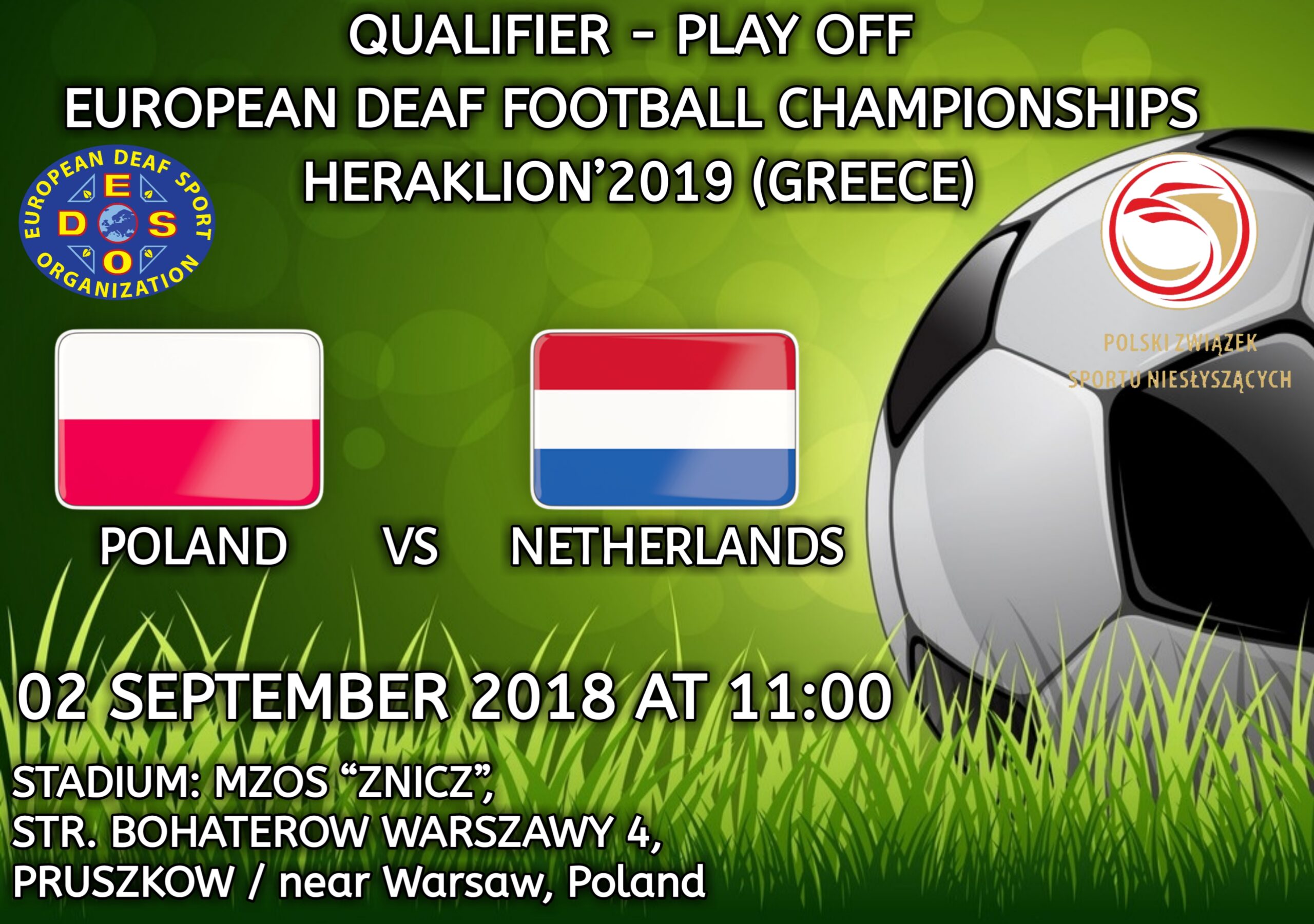 20 Aug 2018: Play off match: Poland vs. Netherlands, 2 September 2018. Kick off 11.00h.